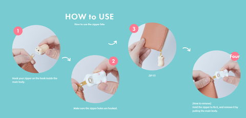 ZipperBites are easy to use. Attach onto any zipper with pull tab hole.